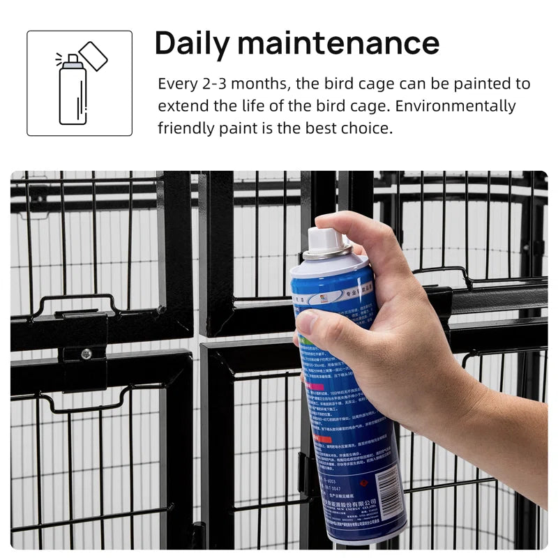 Hold easy maintenance with a wide,access door for feeding and cleaning. The door is easy for the owner to open when the owner is collecting eggs or at refuel time. However, it is a complete secure door, which makes it difficult for the unaimed birds to escape. The large access also make it more convenient when you need to step in to arrange the perch or play with the bird.