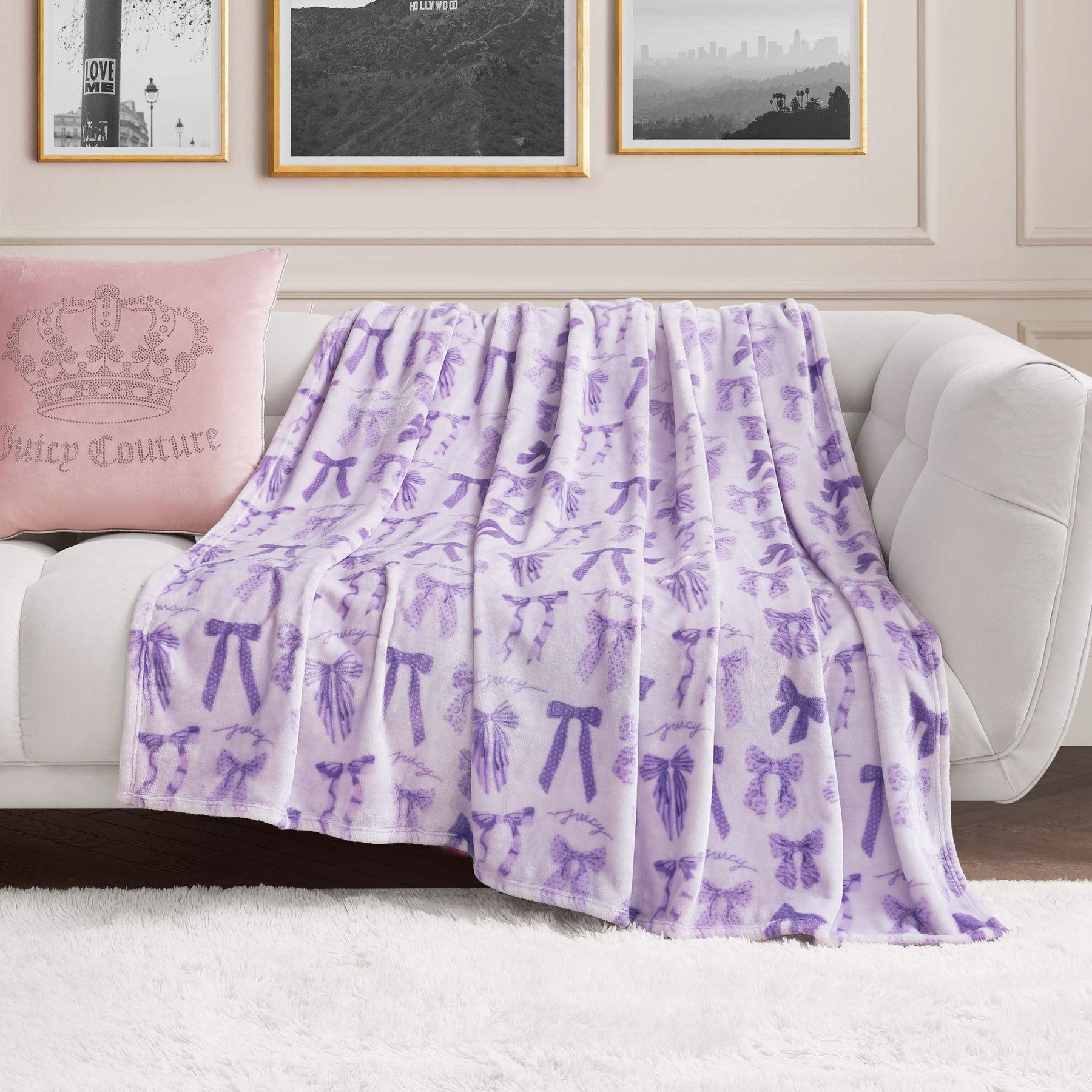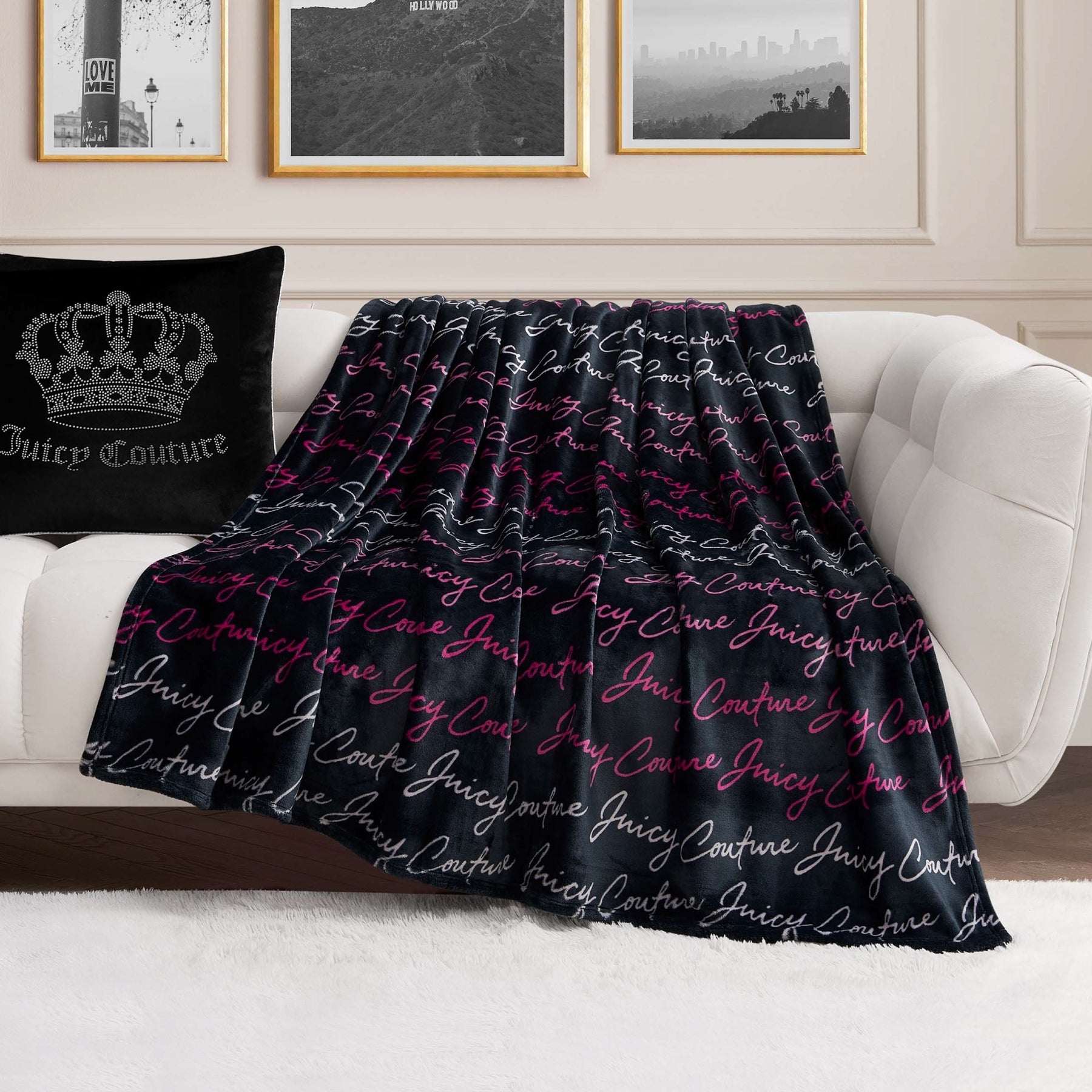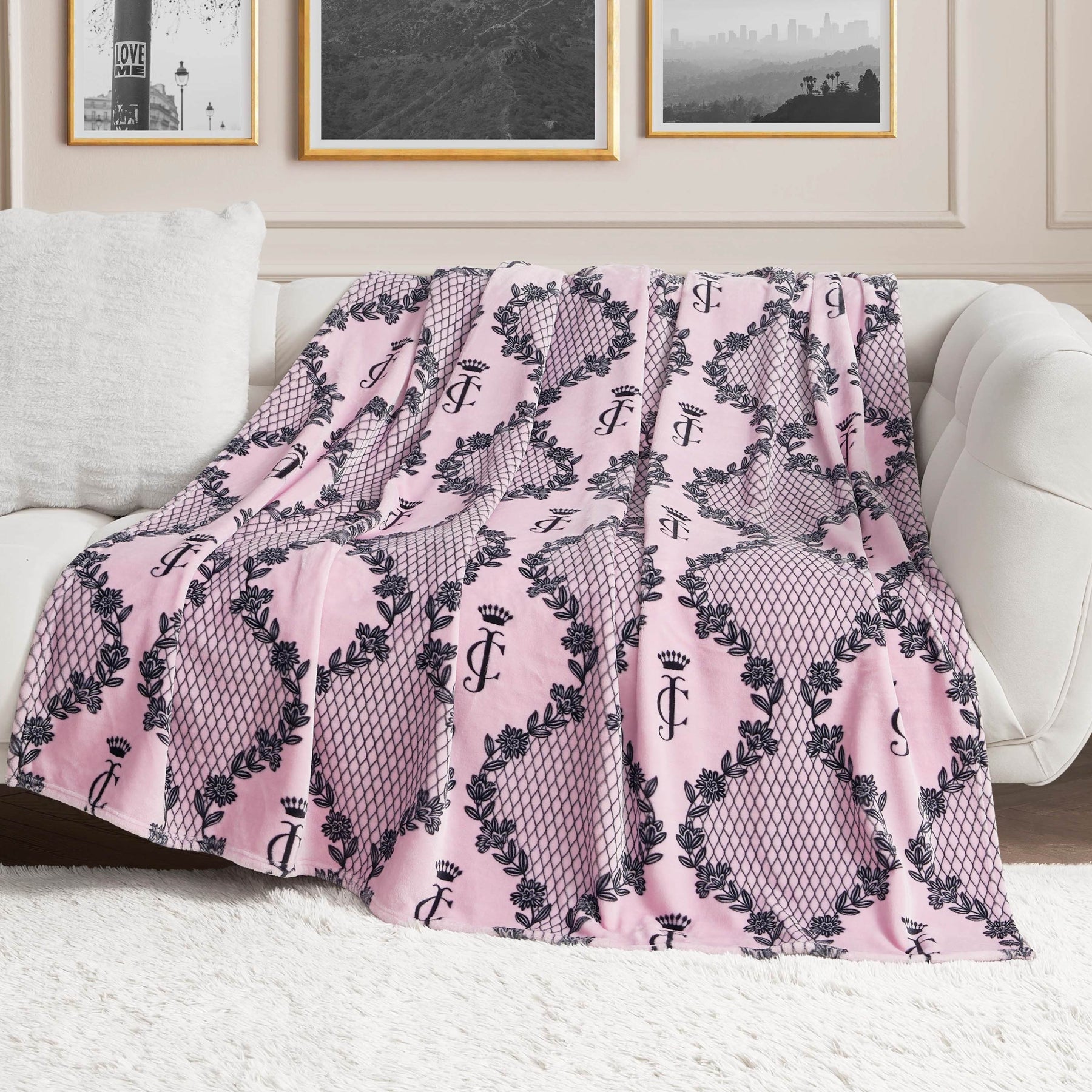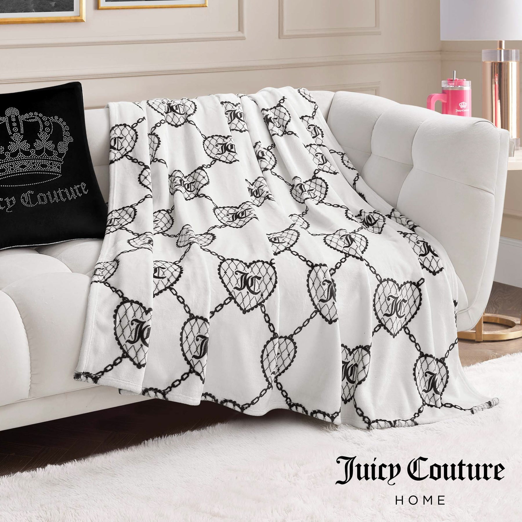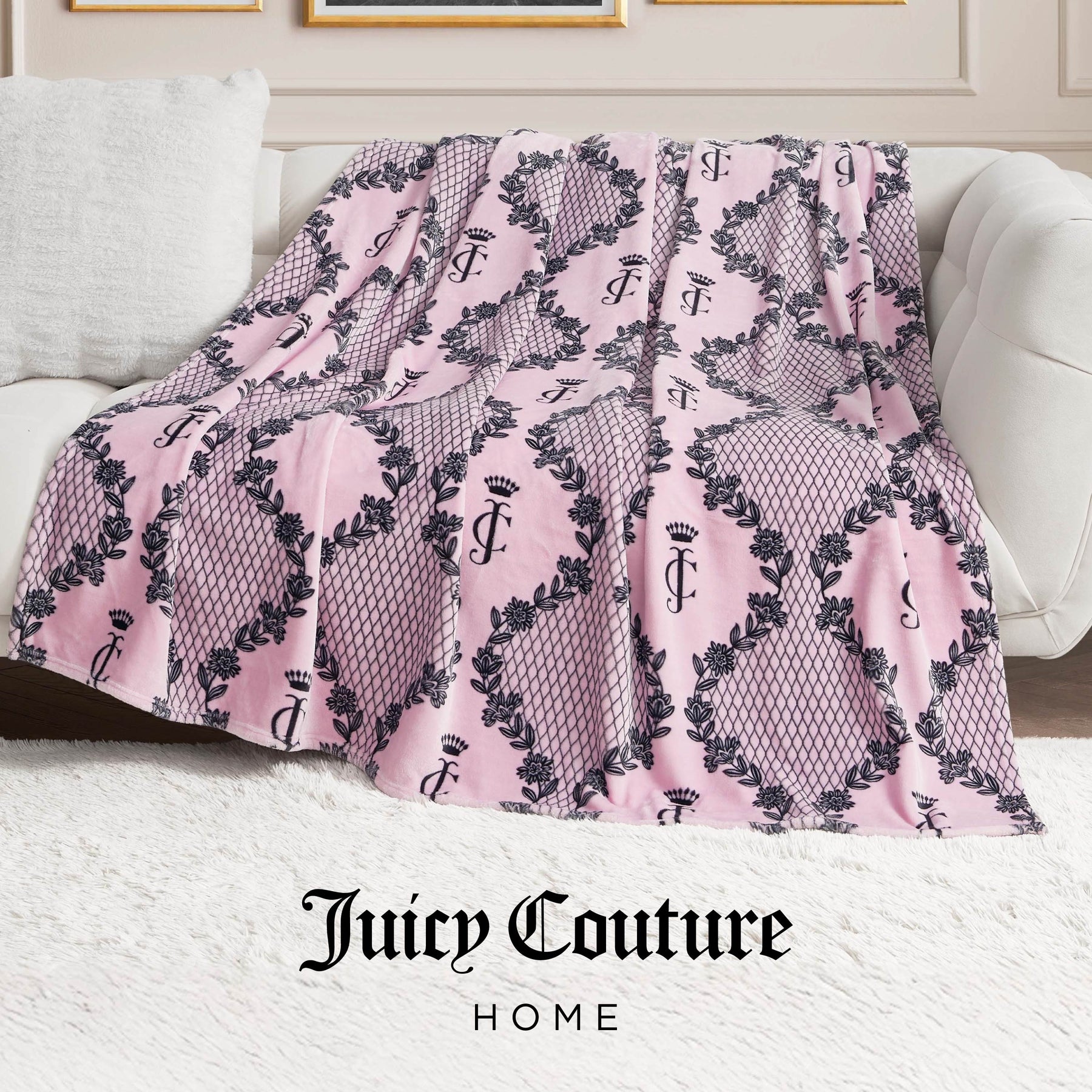 Snuggle up in the lush comfort of the Juicy Couture 60" x 70" oversized plush throw blanket that is made from super silky smooth fabric.