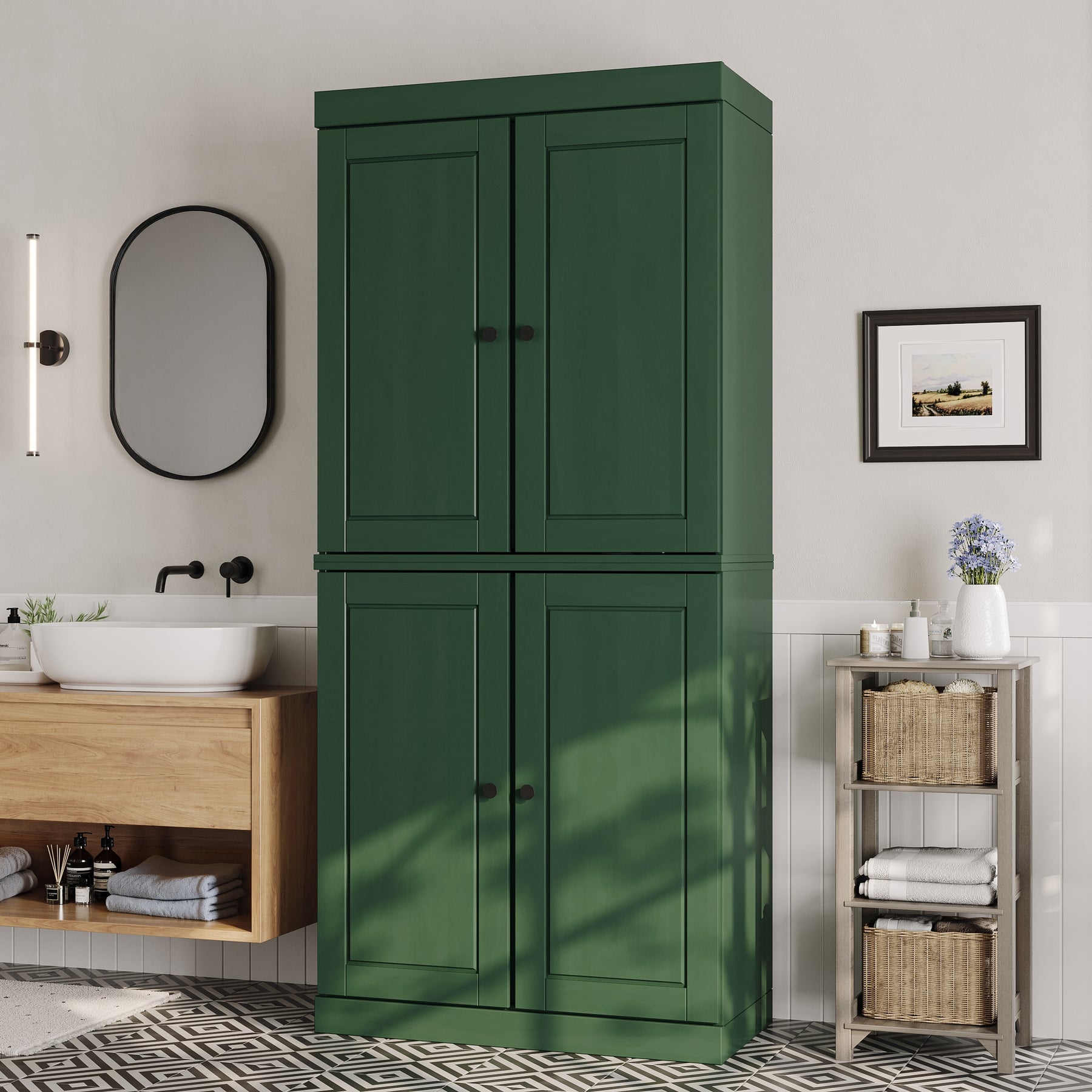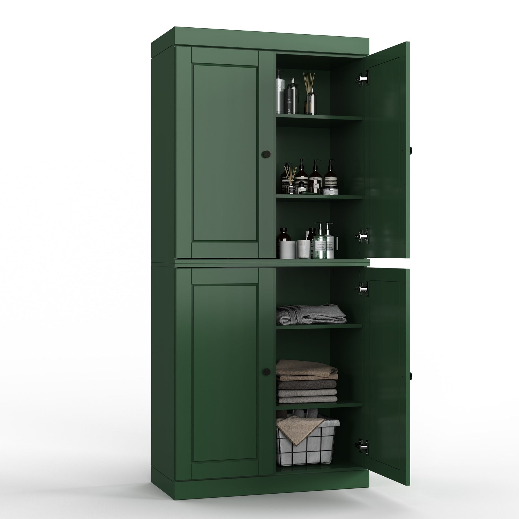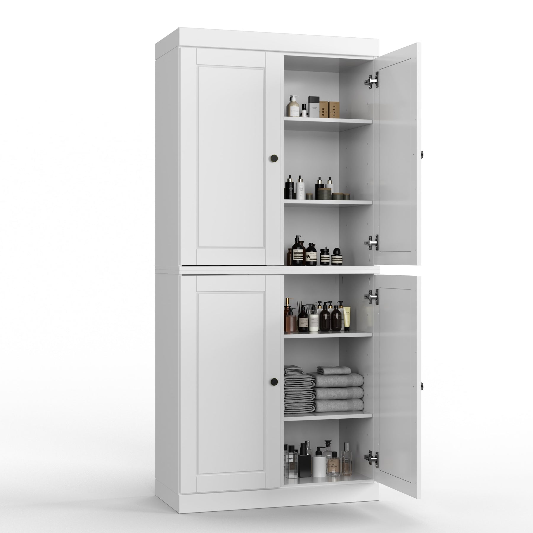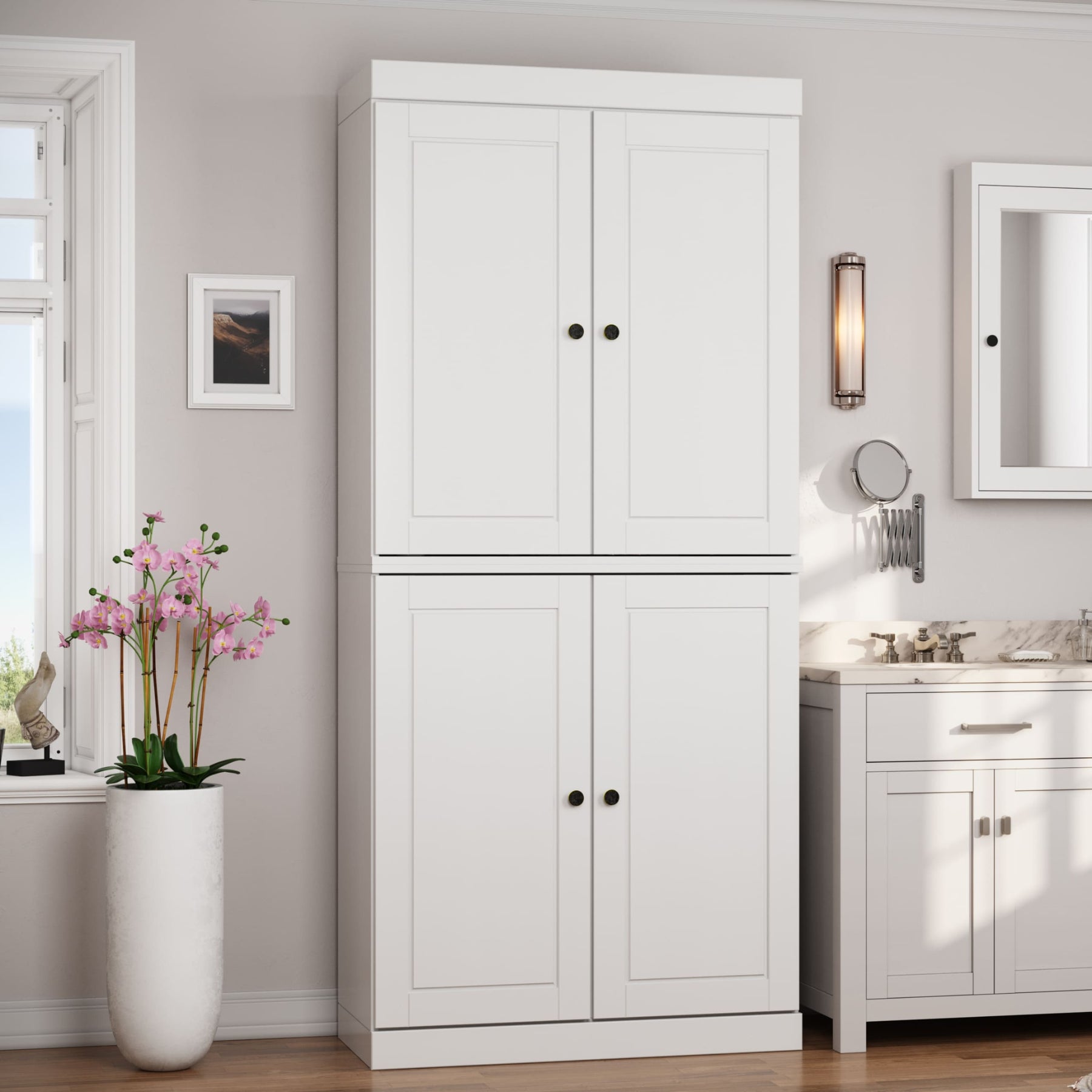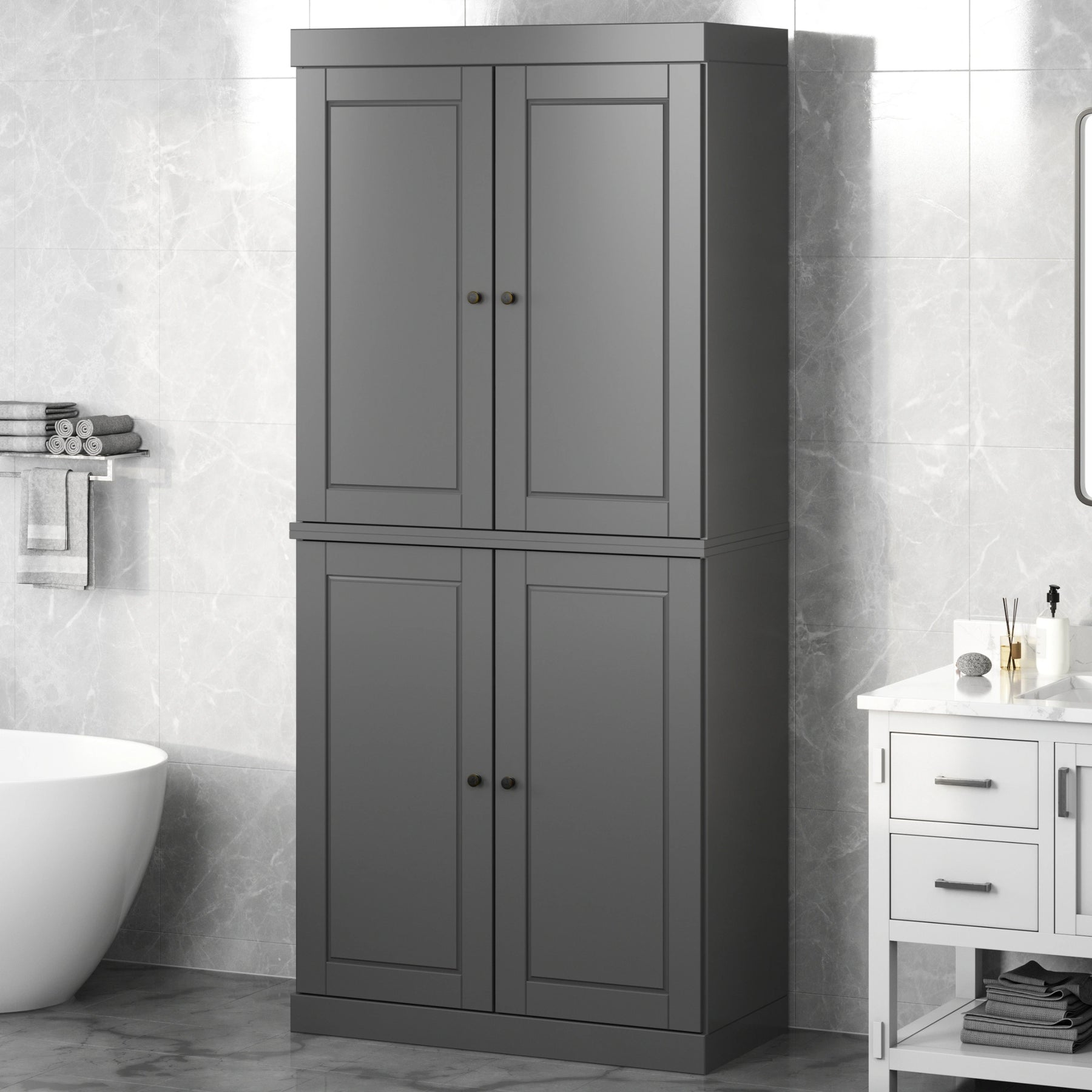 100% Solid Wood Bathroom & Laundry Storage Cabinet, Raised Panel Doors, Adjustable Shelves, 32" Wide, 71.5" Tall