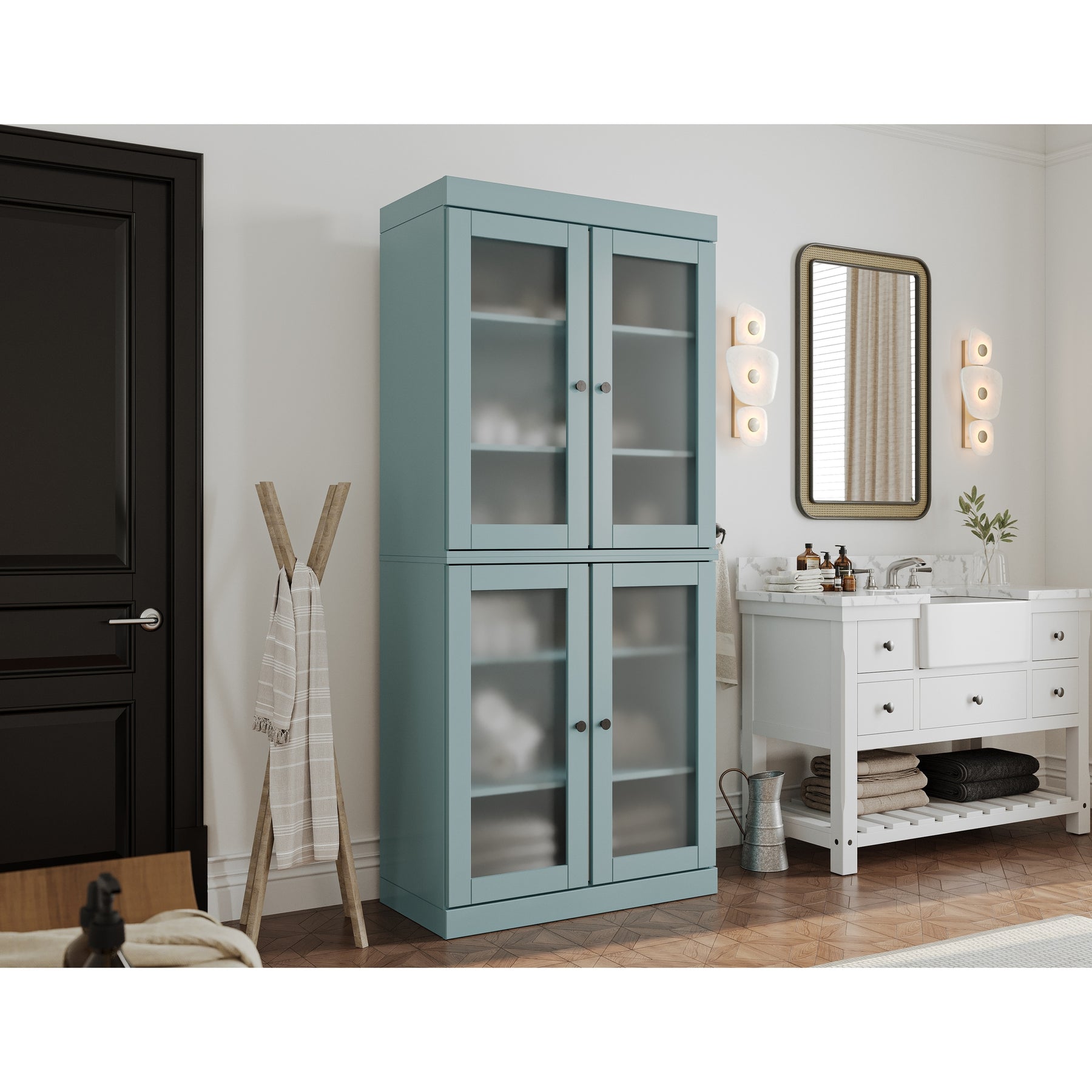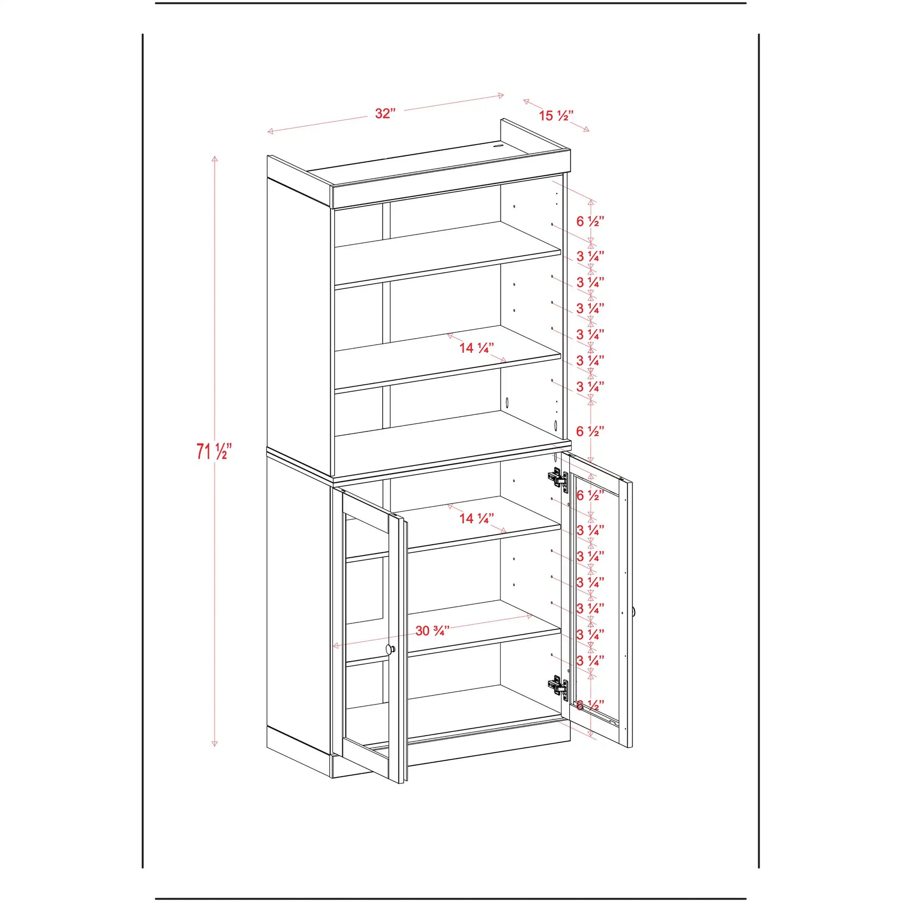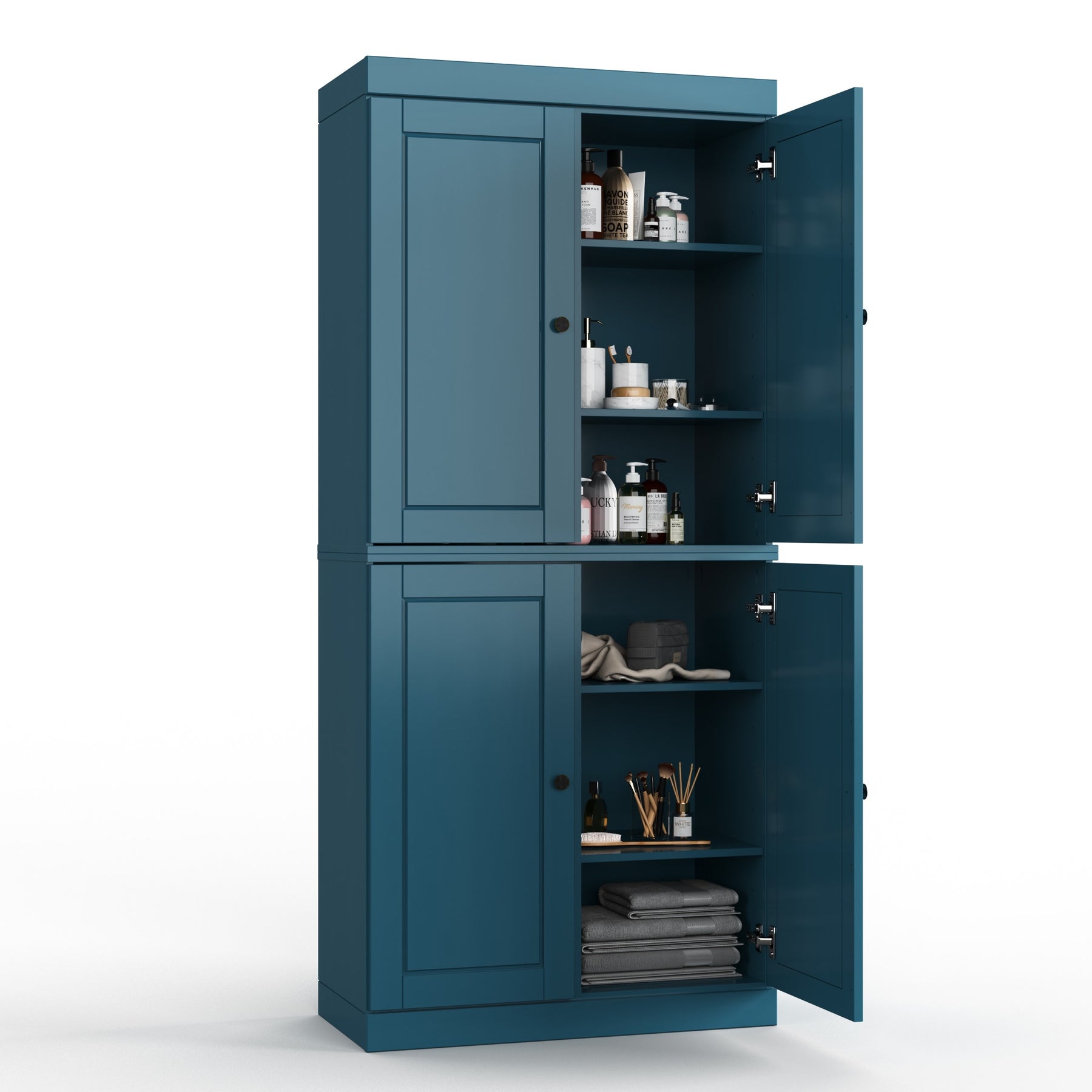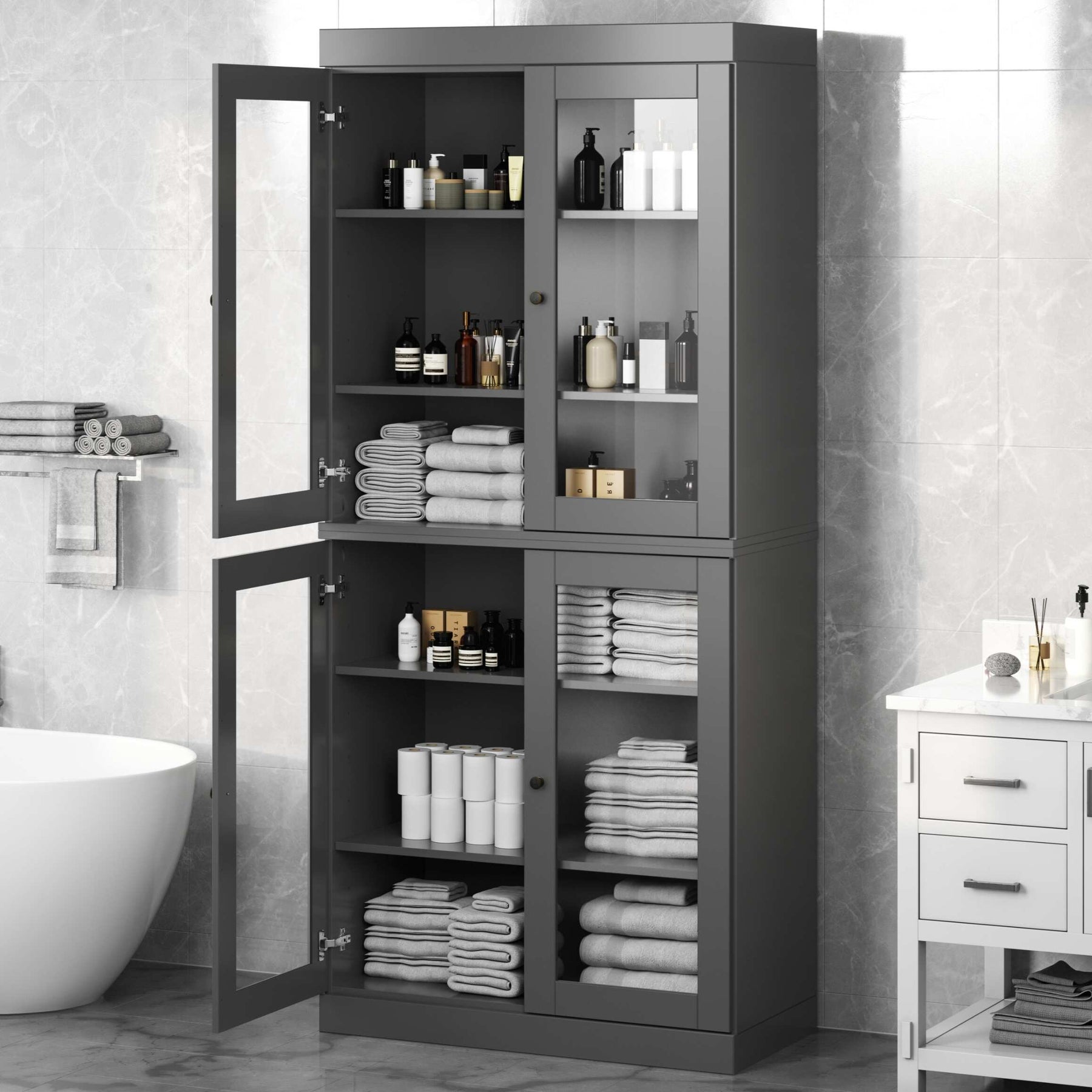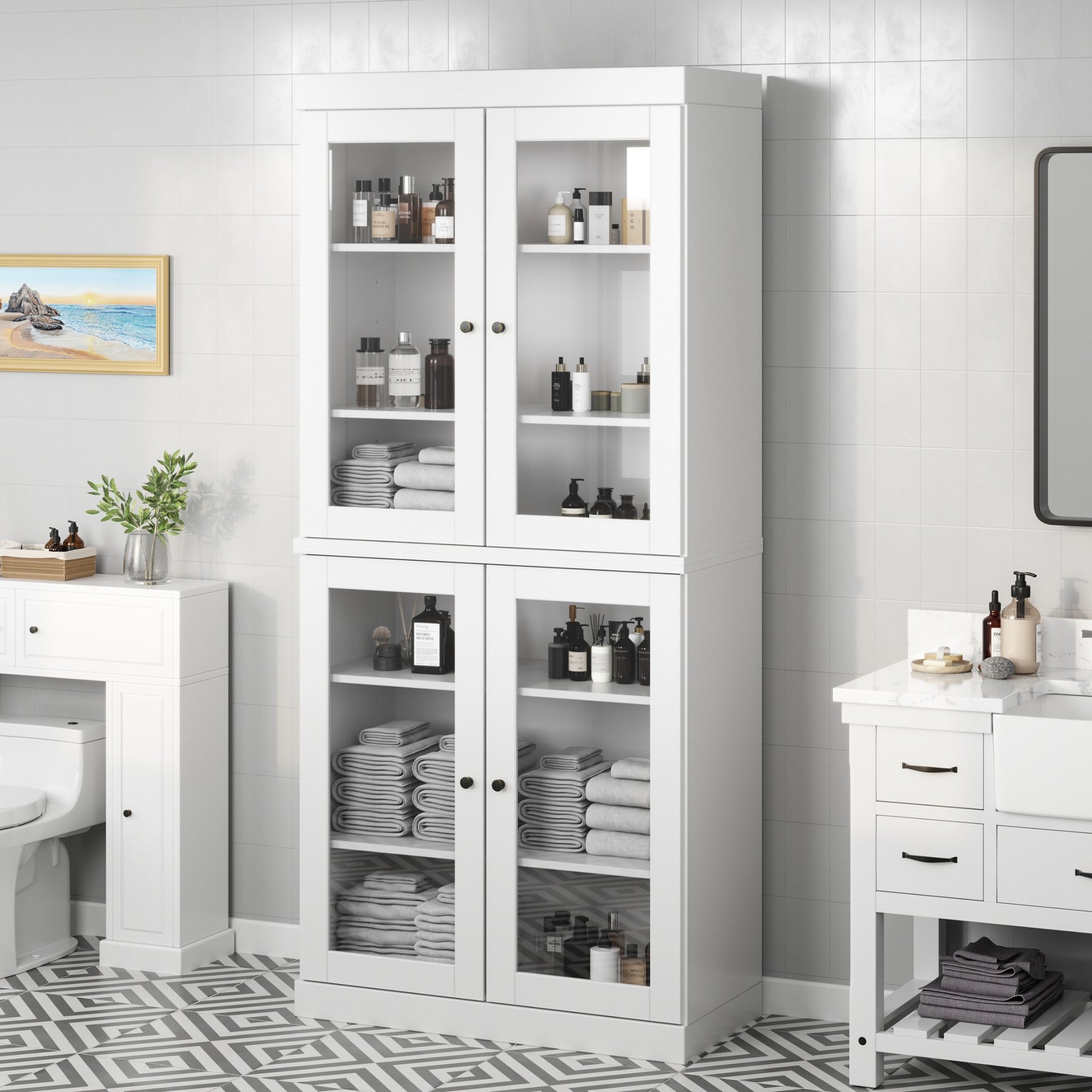 100% Solid Wood Bathroom & Laundry Storage Cabinet, Raised Panel Doors, Adjustable Shelves, 32" Wide, 71.5" Tall