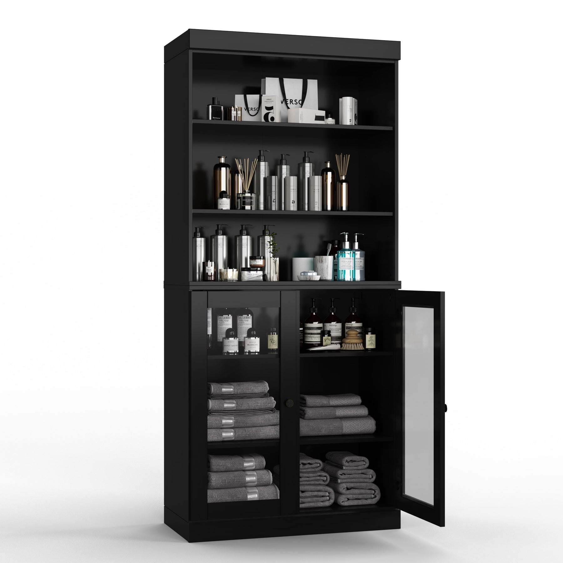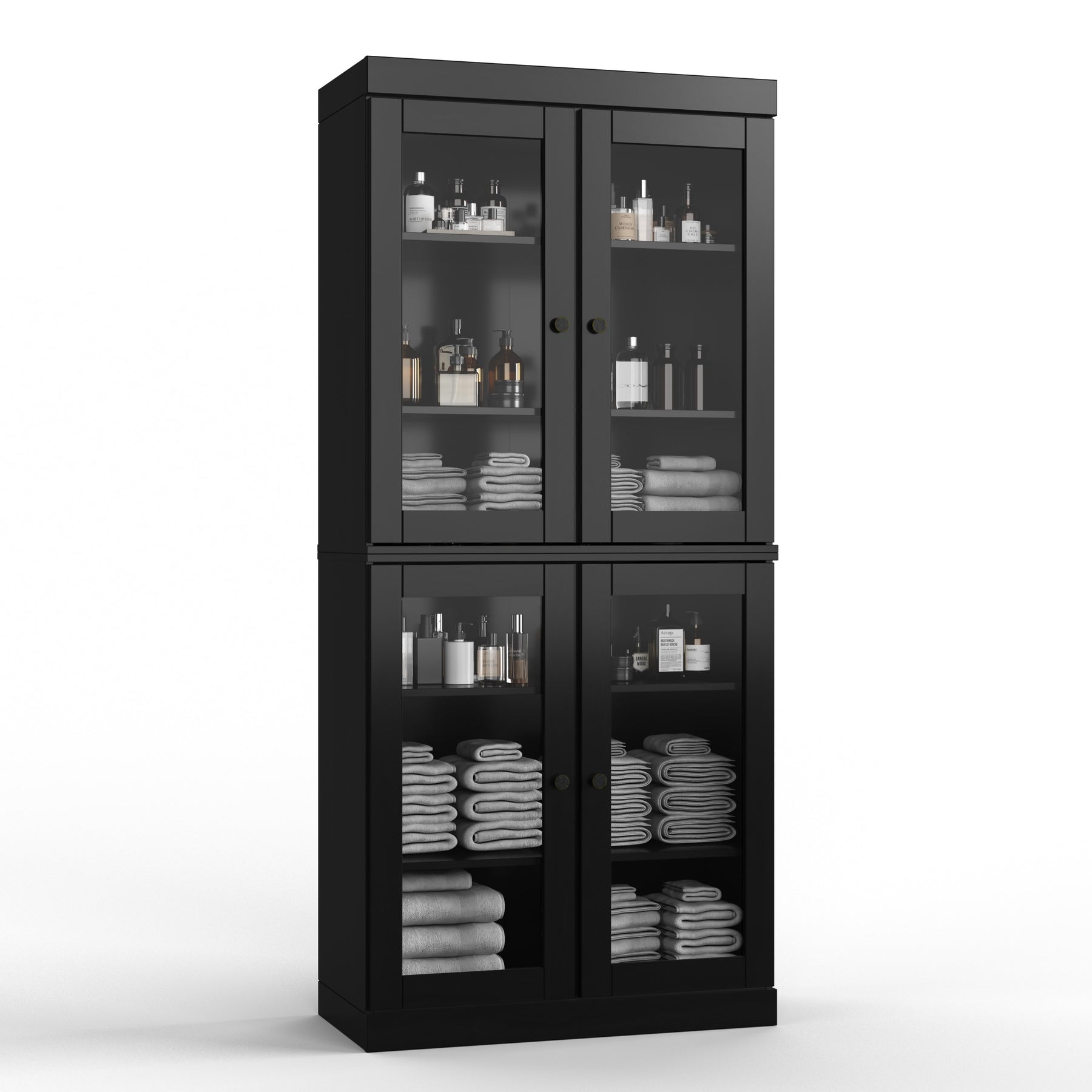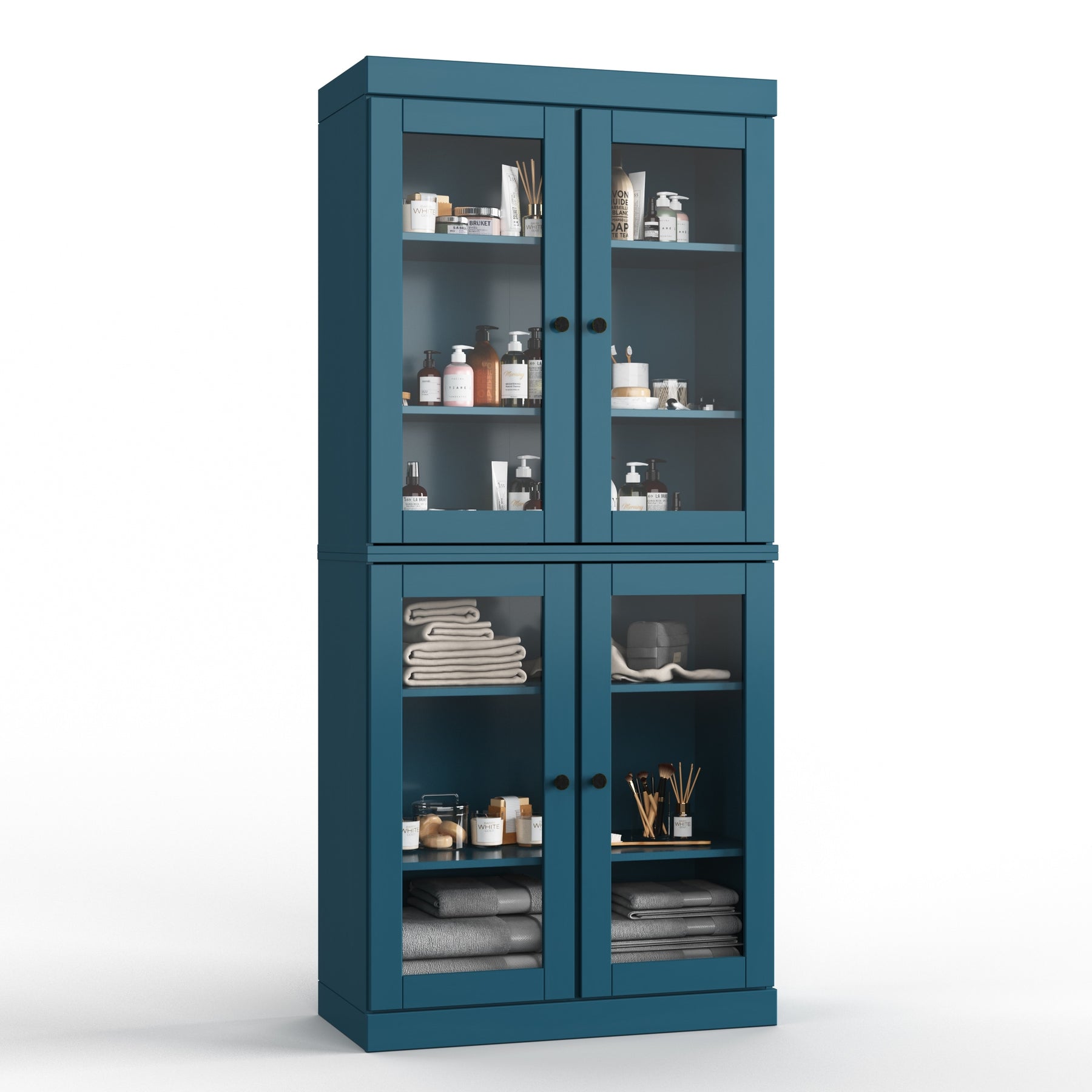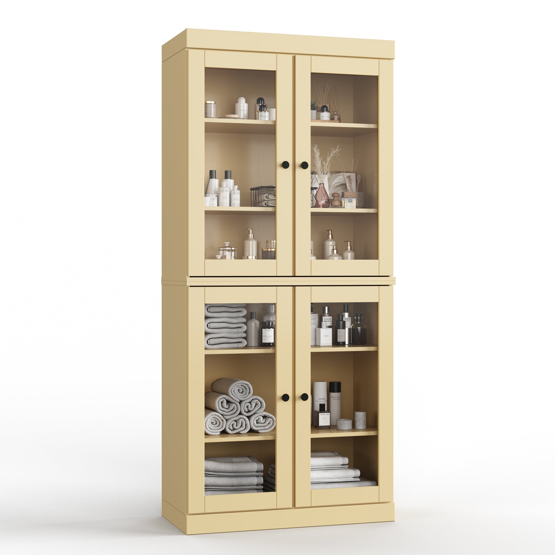 Four removable and adjustable shelves maximize your organizational efficiency. Supported by 16 heavy,duty metal pegs, you'll have the freedom to change the interior to hold anything from long bottles of cleaning supplies to stacked dinnerware. The stackable design also gives you the flexibility to break down the set into separate sideboards should your needs change.