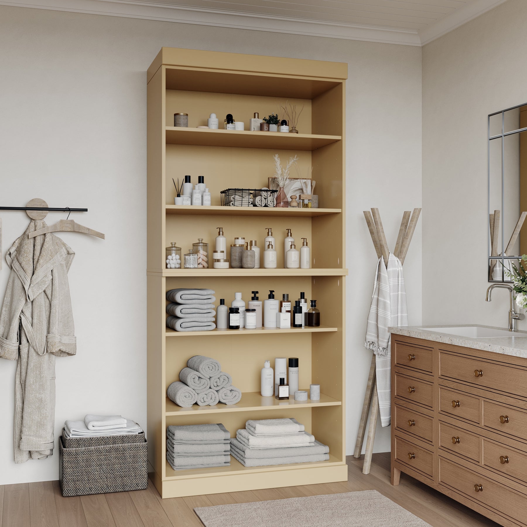 Any home as versatile as it is practical! Crafted from sustainable (kiln dried to prevent warping or splitting) pine, this piece of furniture is a timeless addition to any home. Whether it is filled with bathroom linens, a wine cellar, shelves for every backpack, or a library of professional books, this piece will blend unobtrusively into any room. This piece stands at a height of 71.5"