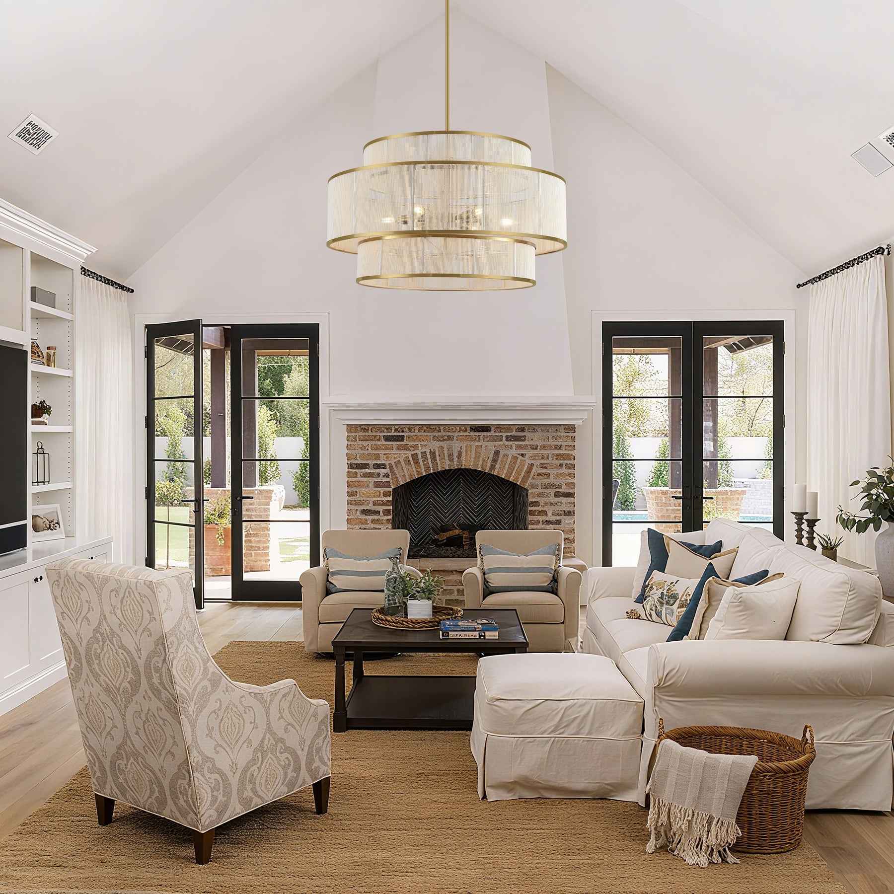 Elevate your living space with this stunning multi-tiered chandelier. Boasting an elegant design that artfully combines a gold-toned metal frame with delicate rattan lamp shades, it emits a warm and inviting glow, thereby creating a cozy yet sophisticated atmosphere. It is perfectly suited for living rooms, dining rooms, or any area where you wish to add a touch of refined style and ample illumination.