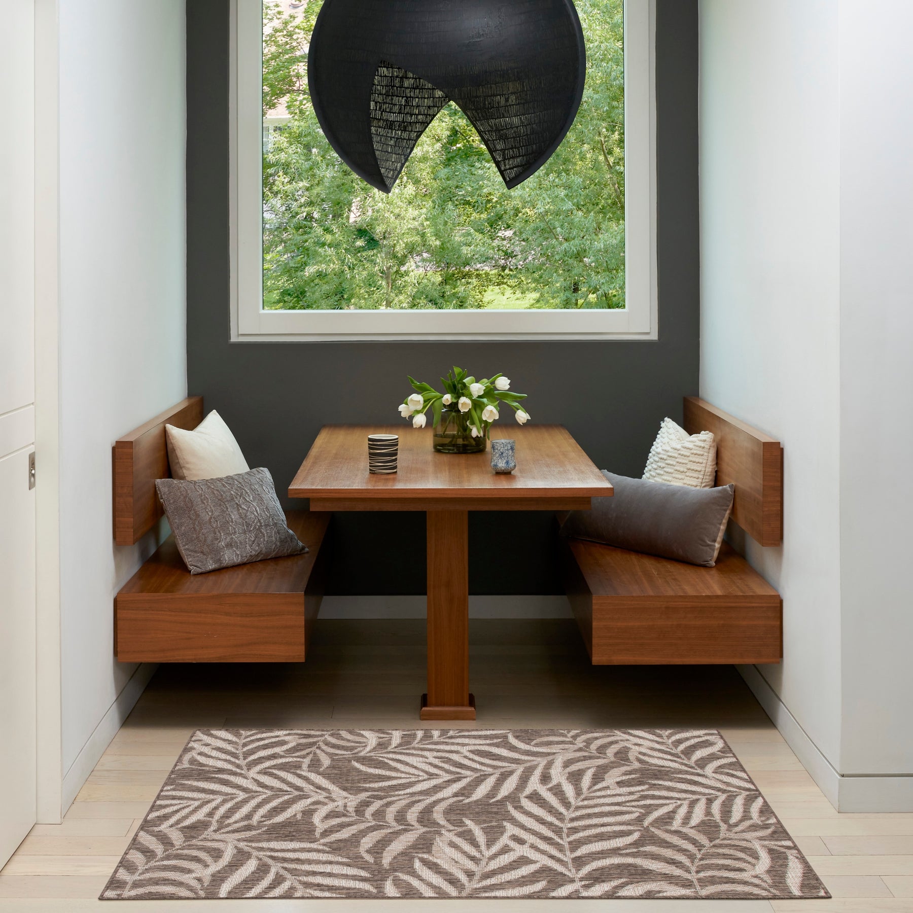 Such construction on this rug lends it to be very adaptable. Whether placed out on the poolside or veranda, the tough construction is suited to withstand those elements but the elegant design lends it to be a refined addition inside a dining room or living space. The tropical theme serves as an instant "decorator" piece that can add on a sense of continuity to transition areas of your home and protect the floors underneath.